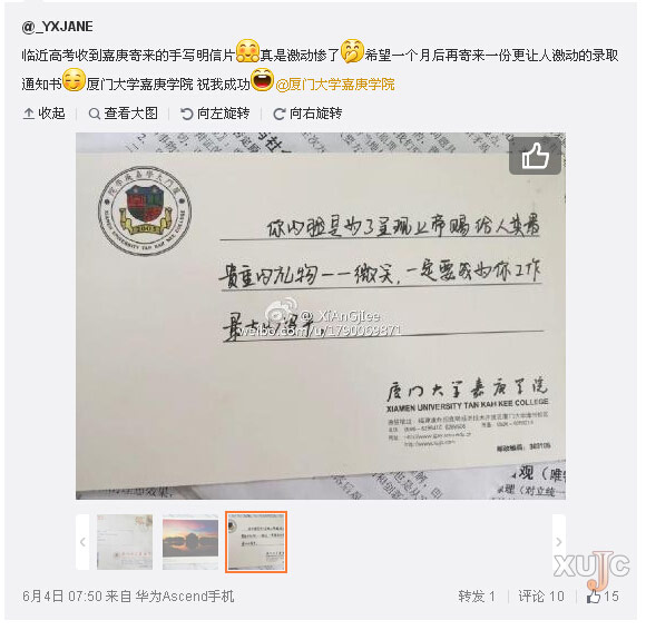 5月,高考前夕,学校官方微博发布#写给准嘉人的100张明信片#活动,为关注我校、有意报考我校的高三生寄送明信片。明信片上的励志祝福由在校生学长学姐书写。活动推出后,官方微博平台收到100多条留言,同们学除了私信地址希望收到明信片外,还有的在评论中表达自己对嘉庚学院的向往。微博名为@_岛君-缝纫技能修炼中 同学说:“想要考上嘉庚的心情给了我很大的学习的动力。”收到明信片的@_YXJANE 同学急着发微博展示:“临近高考收到嘉庚寄来的手写明信片,真是激动惨了,希望一个月后再寄来一份更让人激动的录取通知书。”