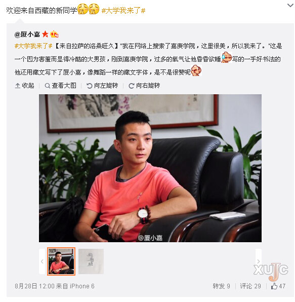 初到“嘉园”的新生也各有故事,官方微平台通过“大学我来了”话题及时捕捉和讲述新生的故事。藏族新生洛桑旺久通过@厦小嘉微博分享他与“嘉园”的缘分:“我在网络上搜索了解了嘉庚学院,这里很美,所以我来了。”他还用藏文写了“厦小嘉”三个字送给小编。人文与传播学院新生曾豪热爱音乐,他带着全套录音设备来上学的故事通过微博发布后,获得了诸多点赞与鼓励。