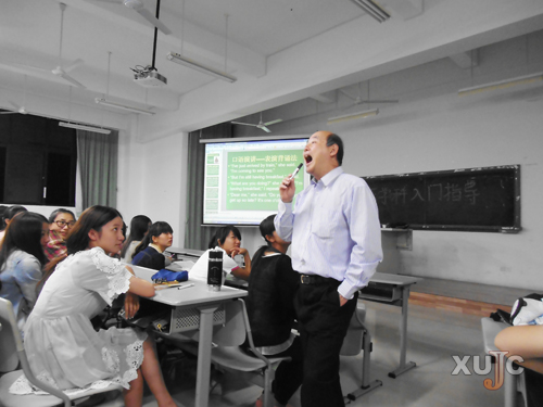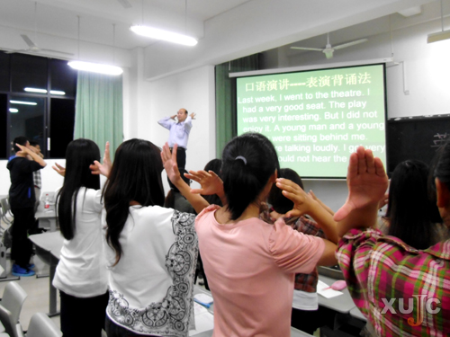 纪教授用人际之间的关系生动形象地阐述了英语口语中的语调、重音、连读、省略等音际关系。纪教授还亲自为大家示范,他抑扬顿挫的语调和夸张的动作相结合,声情并茂地为大家朗读一段英文文章,赢得了阵阵的掌声。