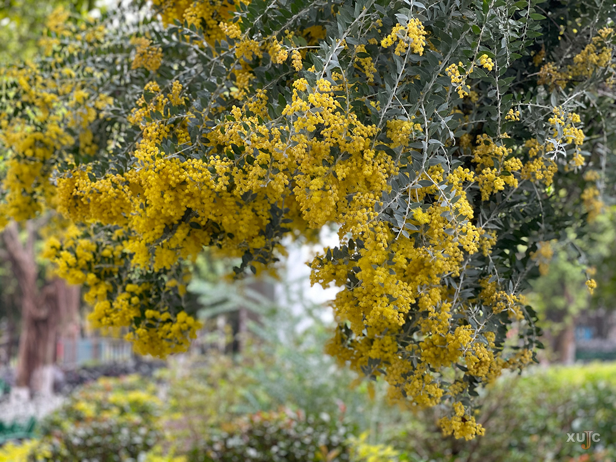 1至3月开放的珍珠金合欢花小巧玲珑。金黄色的花瓣在阳光下闪耀着珍珠般的光泽,展现一种优雅而含蓄的美。