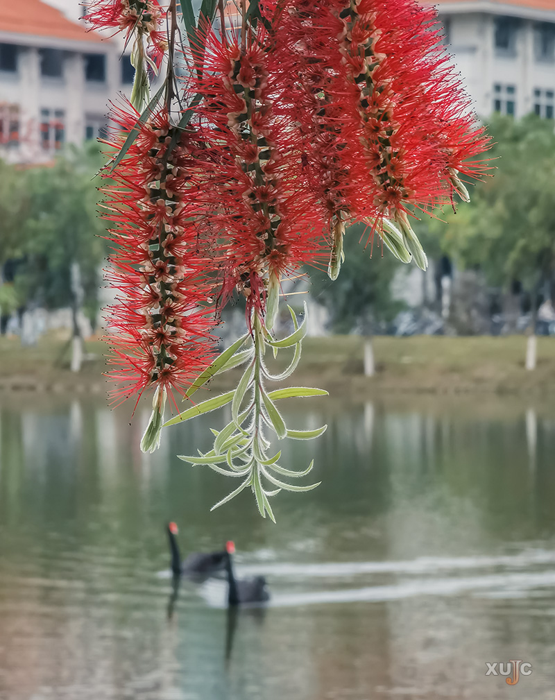 垂枝红千层(又名串钱柳)的花期从4月开始,到9月结束。它的花朵宛如一串串垂挂的红宝石,红得热烈而奔放。绕湖而种的它,为栖霞湖畔增添了一抹浓烈的色彩。
