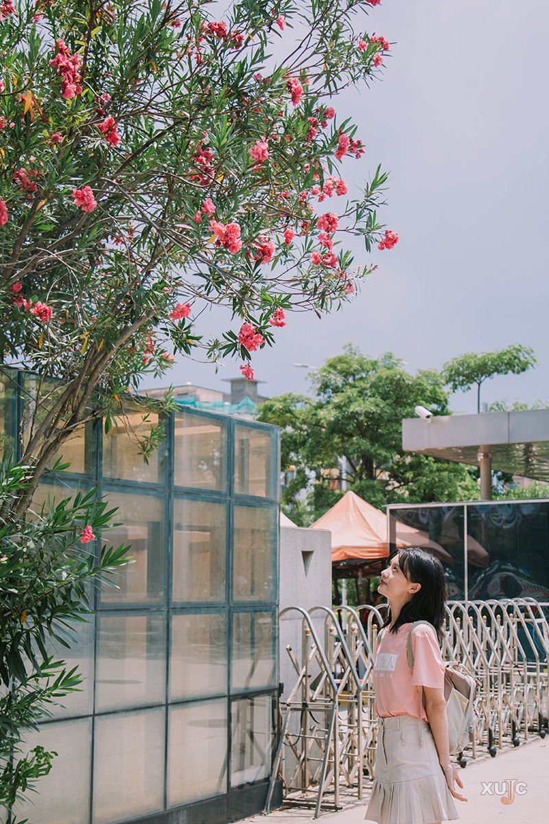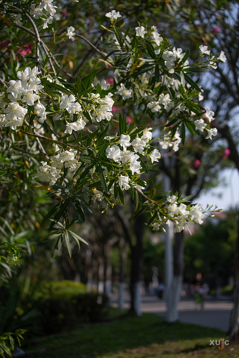 校道旁的夹竹桃也不甘示弱,全年开花。它们或粉或白,簇拥在枝头上,随风起舞。就如它的花语“坚强和热情”那般,“嘉“人们在求学的路上则热情满满,勇往直前。