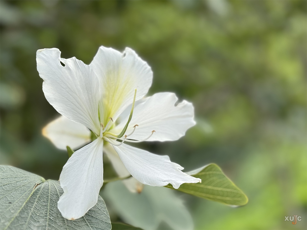 白花洋紫荆的花期很长,可从10月开放至第二年的4月。它的花瓣柔软而细腻,散发着淡淡的清香。满树花开的白花洋紫荆,让步道上的行人更深刻地感受到岁月的静好。