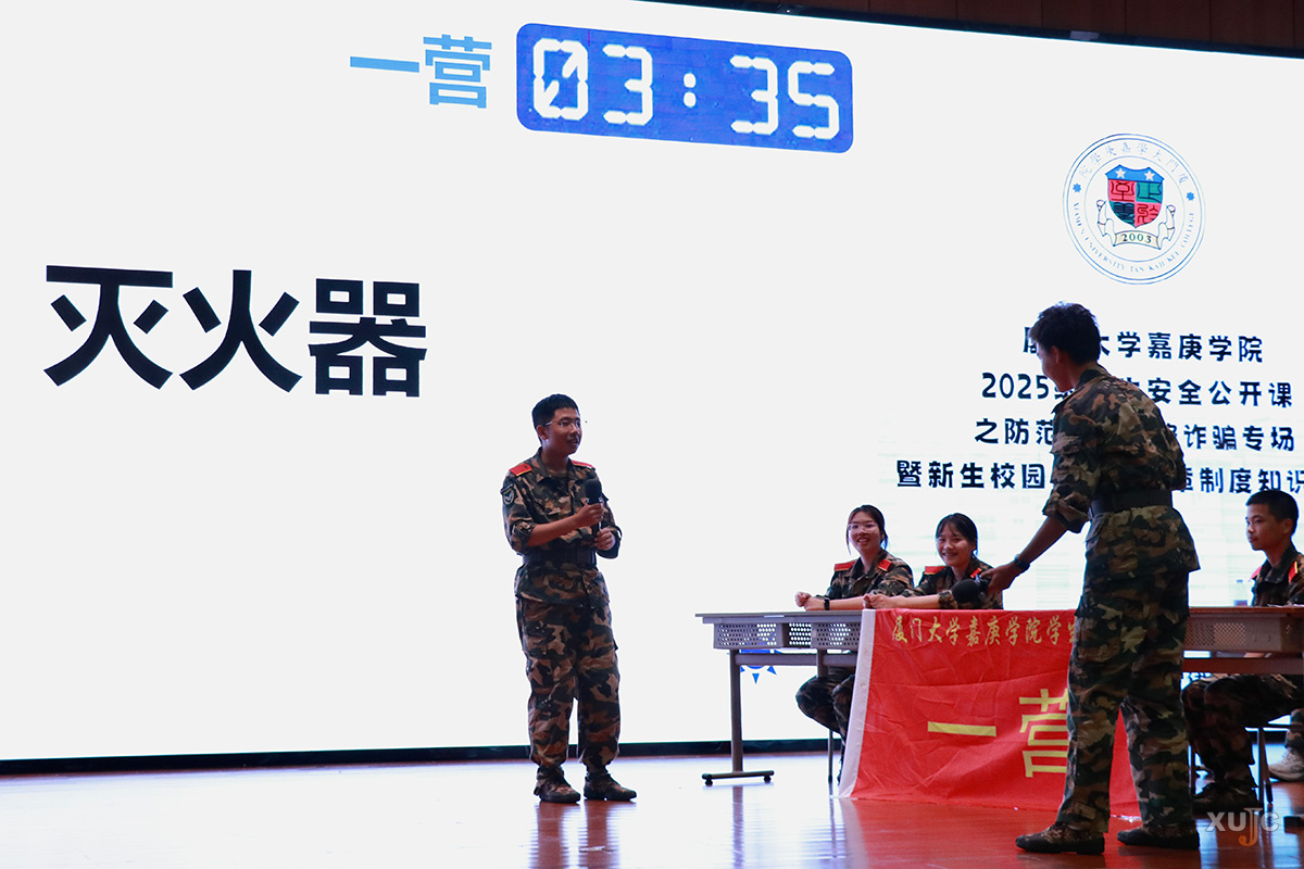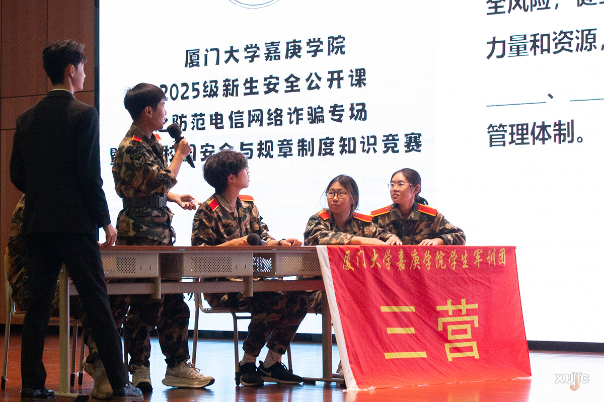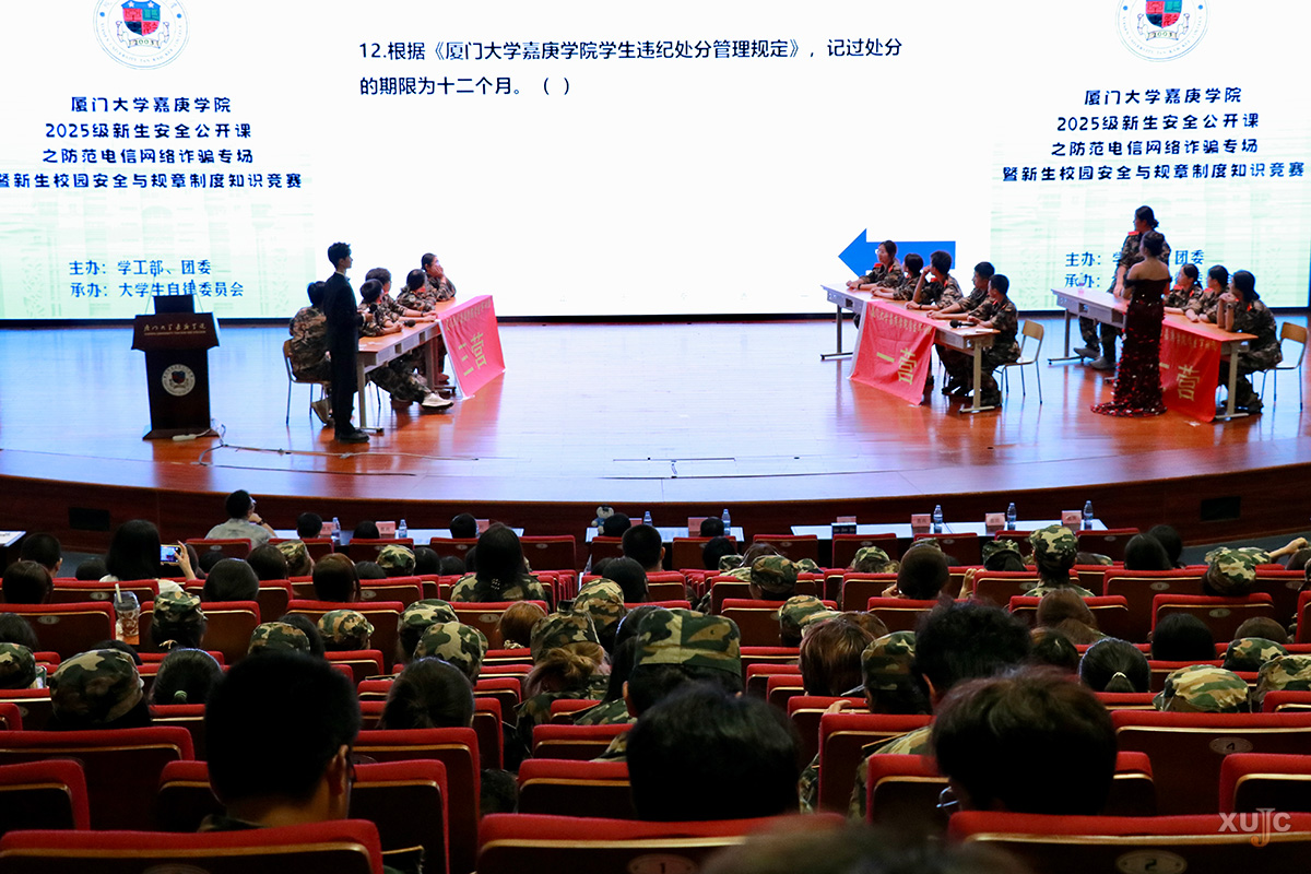 “安全普查”环节不仅检验参赛选手们的知识储备,也为在场全体新生普及了实用的“嘉园”安全知识。每支队伍轮流抽取题目进行选择题、填空题和判断题的作答。