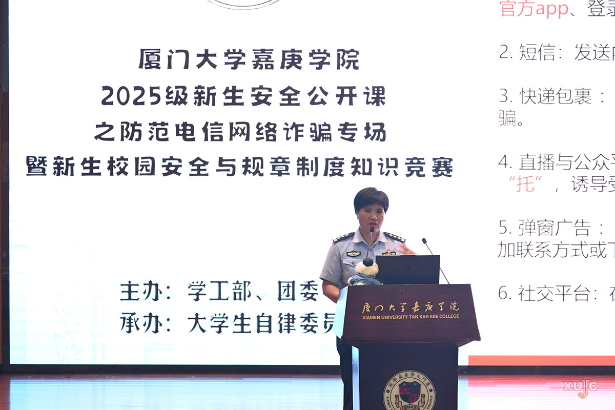 叶少加警官以“全民反诈,慧眼识骗”为主题,为全体新生带来一堂生动的“防范电信网络诈骗”专场讲座。她结合近年来发生的真实案例,深入剖析了刷单返利、杀猪盘、色情敲诈、演唱会门票代购等校园高发诈骗类型。那些触目惊心的数据,让在场学生深刻意识到防范电信网络诈骗不仅是一场与骗子斗智斗勇的“心理战”,更是每位大学生必须修习的“终身必修课”。