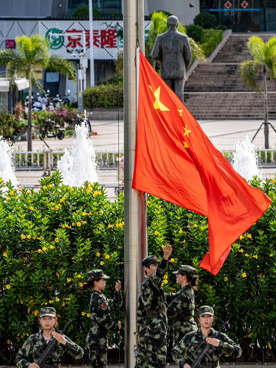 在雄壮的国歌声中,五星红旗冉冉升起,迎风飘扬。