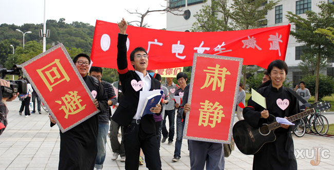 两位男生举着“肃静”、“回避”的牌匾走在队伍最前面,而一群穿着表演服的男生则身上插着各种彩旗,高打“09广电女生威武”红色横幅与“09广电女,感谢你们”等各种牌匾跟在后面。一路上,“我不淡定,我不寂寞,因为你们,我骄傲,因为你们,我自豪”的牌匾吸引了很多过往同学的注意。