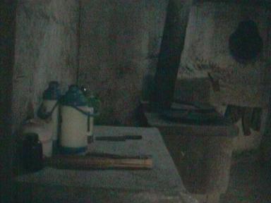 往边门过去的就是这家的厨房,只可以用“黑暗”来形容。传统的烧柴的炉灶,如澡盆大的一口锅,煮上由玉米面和着其他一些面食煮出的糊糊,配上家家都会腌制酸白菜,或者再喝上一盅暖和的甘蔗酒,这些便是一家人难得的晚餐。更不要说能吃上一点肉了,那些沾了油的菜,对这些山里面生活的人们来说,仿佛就是一个奢侈的享受!房梁上挂着的腊肉和腊肠,据说是某一年宰了一只猪,做成的干肉,以供全家未来2-3年食用!一个队员经不住要问:“那些养着的鸡、鸭什么的,为什么不杀来吃呢?”校长把这话译给村民们听,大伙一听就乐了:“鸡、鸭下蛋我们留一点吃,多的拿去城里卖了给娃儿们挣学费,把它们杀了日子怎么过呢?”