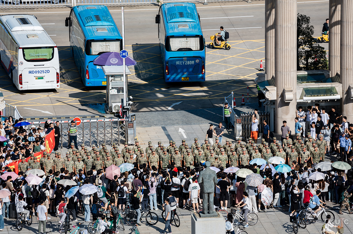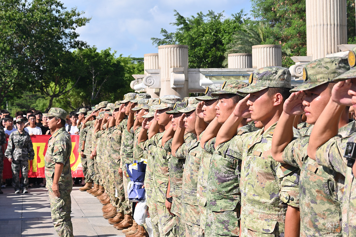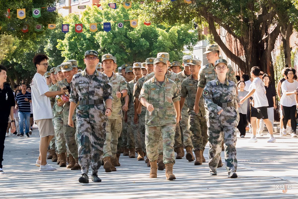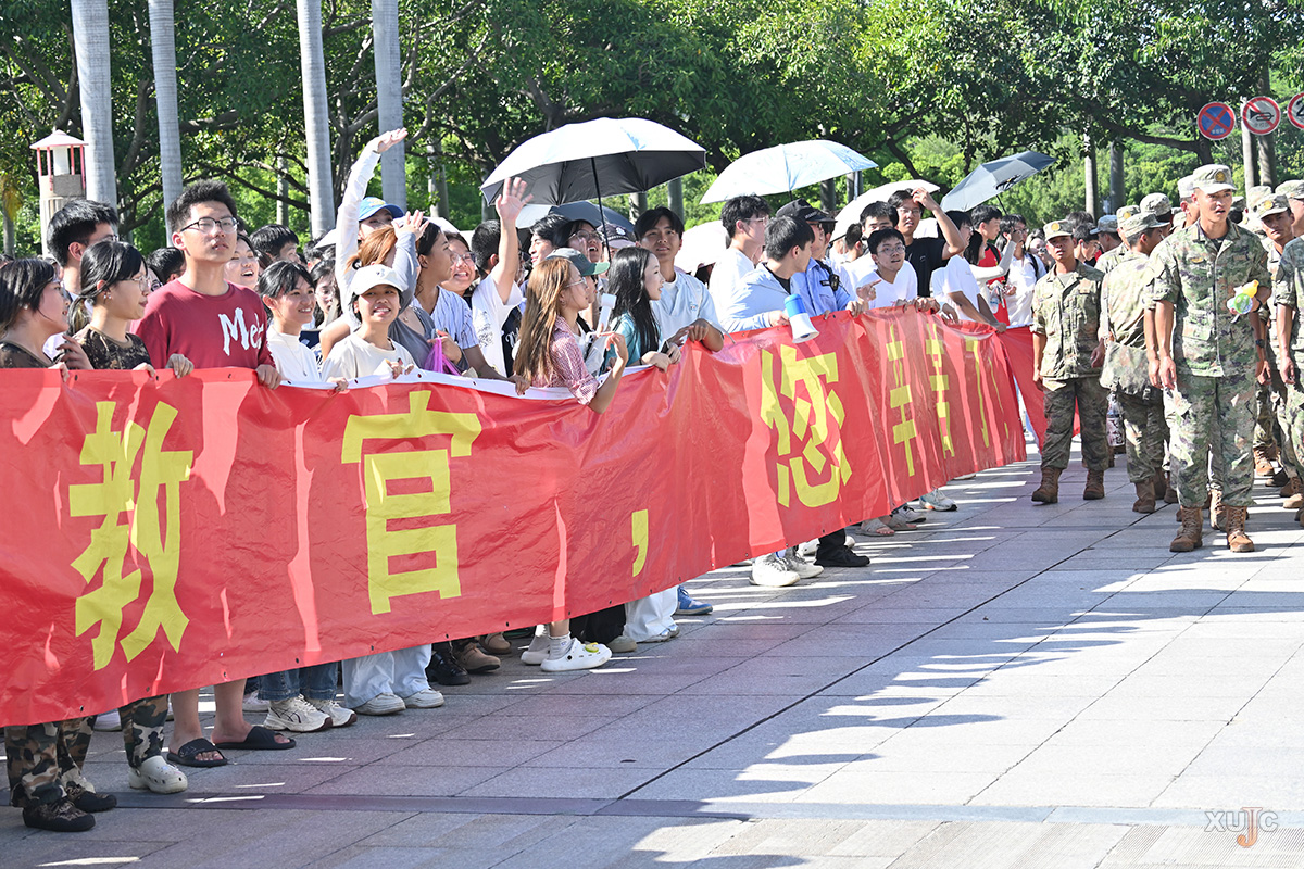 三点整,身着整齐军装的教官们迈着铿锵有力的步伐,列队而来,沿着嘉庚大道,准备踏上归程。