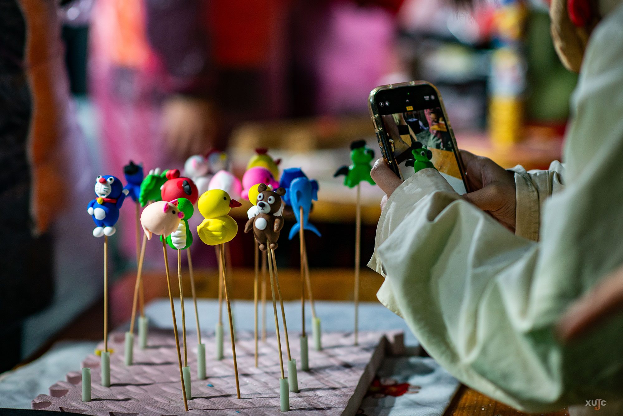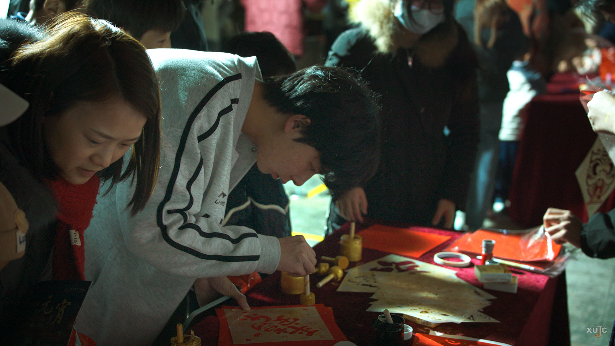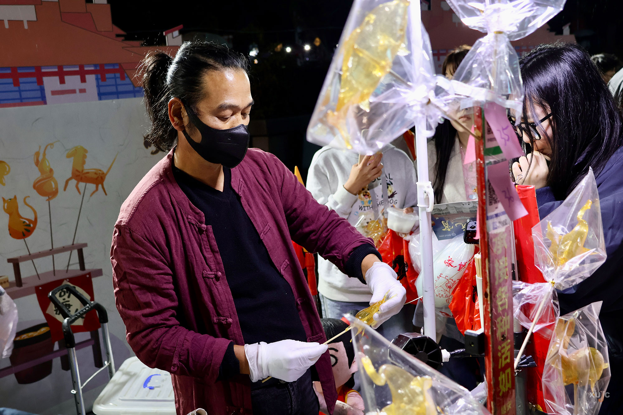 民俗文化区内,捏面人、吹糖人、写春联、剪窗花、脸谱DIY、作诗互动等传统技艺体验项目吸引了大批师生驻足。大家用游戏中赢取的“汤圆”兑换体验机会,在非遗传承人与学生社团的指导下,亲手制作属于自己的民俗作品。