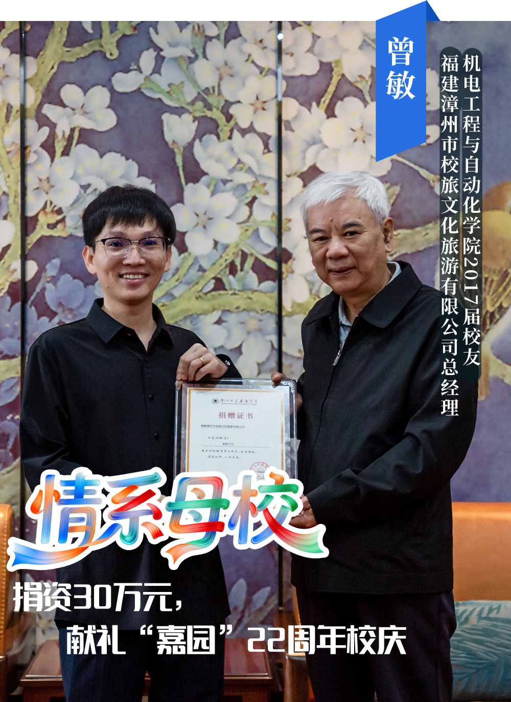 为献礼母校22周年校庆,曾敏创立的福建漳州市校旅文化旅游有限公司向学校捐资30万元,专项用于学校新生报到期间的车辆接驳保障工作。这是该公司第二次向母校慷慨捐赠——在18周年校庆时,该公司曾捐赠20万元设立“校旅”至善奖学金。