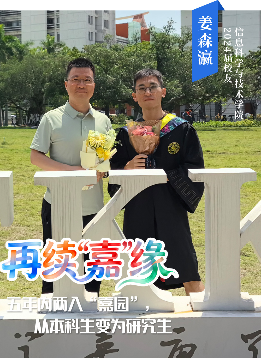 2025年,姜森瀛以总分396分、专业排名第四的成绩,考取厦门大学—嘉庚学院联合培养项目研究生,五年内两入“嘉园”,从本科生变为研究生,延续与母校的深厚情缘。