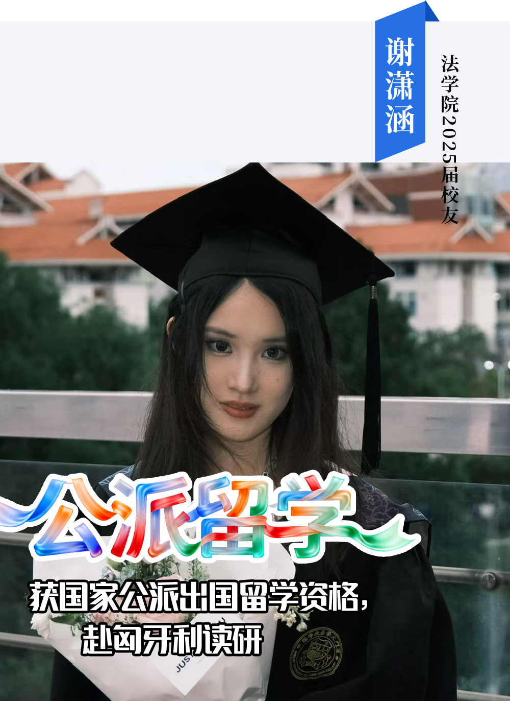 2025年获国家公派留学资格,赴匈牙利德布勒森大学、攻读欧洲与国际商法专业硕士研究生学位。根据协议,谢潇涵在留学期间享受匈牙利政府提供的全额奖学金资助,包括学费与住宿费全免(或提供住宿补贴),并享有部分生活费补助。