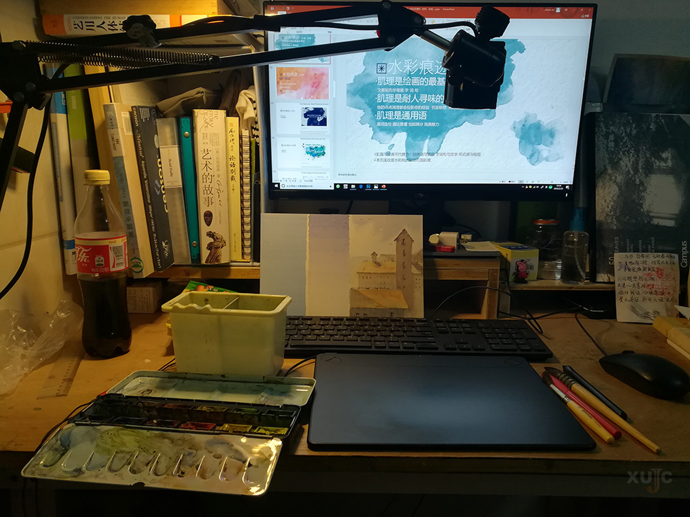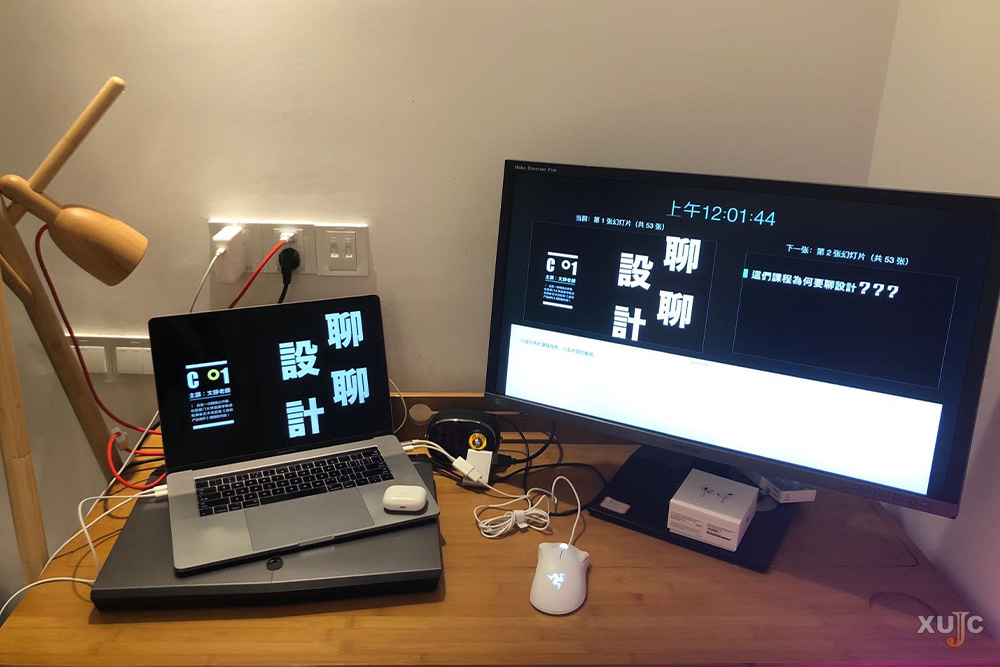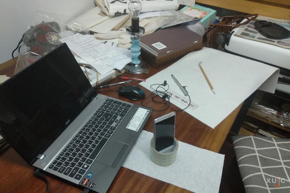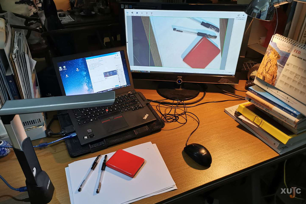 选择一个好的教学平台,是不少教师在线上教学之前的首要工作。艺术设计系叶茂乐副教授在尝试了几个直播软件和教学平台之后,最终选择了钉钉网络平台。他所教授的课程属于技能课程,为了让教学更直观和具有现场感,他临时找人借了一个便捷式同步示范展台,配合手提电脑和显示器,在家里打造了一个直播间。