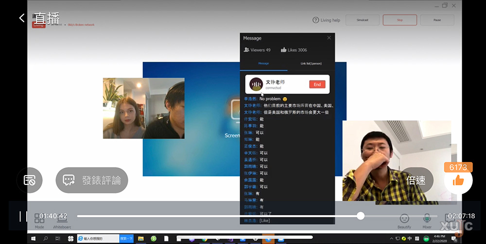 关于出勤的问题,叶茂乐采取线上回复“到”的方法:课程安排30分钟左右休息一次;每一段课开始和结束都要求学生回复“到”;课后登记。叶茂乐说:“非常节约时间,而且基本没有出现半途离场的学生。”
