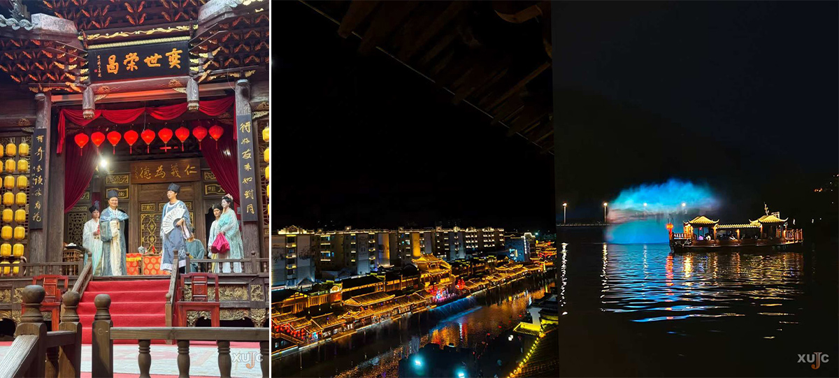 卧龙书院的青砖黛瓦间,古籍与讲堂遗址诉说着客家“崇文重教”的传统;八喜馆内的“乔迁之喜”实景表演,生动呈现客家“八喜”民俗;夜幕下的汀江两岸,灯火与古城墙交相辉映……学子们沉浸式感受“汀水悠悠润客家长汀”的诗意,体悟客家人“以和为贵”的处世哲学与客家文化的精神内核。