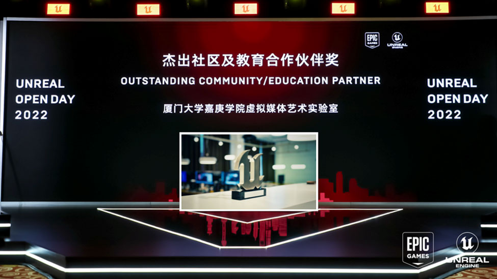 2022年,VR实验室代表我校荣获虚幻引擎“杰出教育合作伙伴奖”