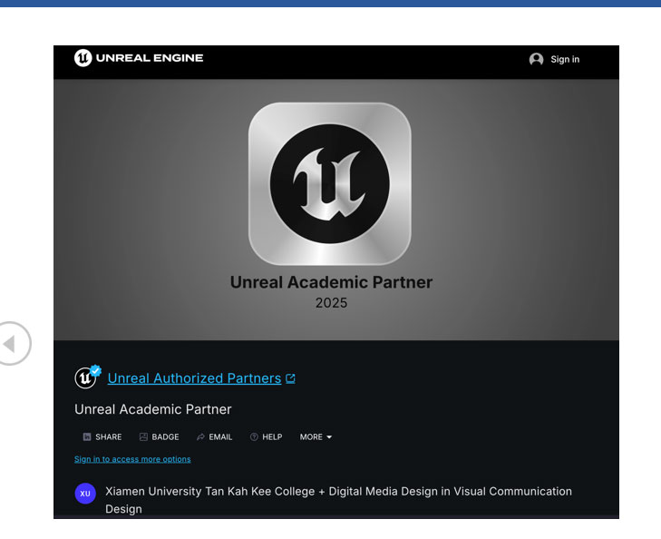 在虚幻引擎官网上,嘉庚学院获得银牌机构的展示图和地址