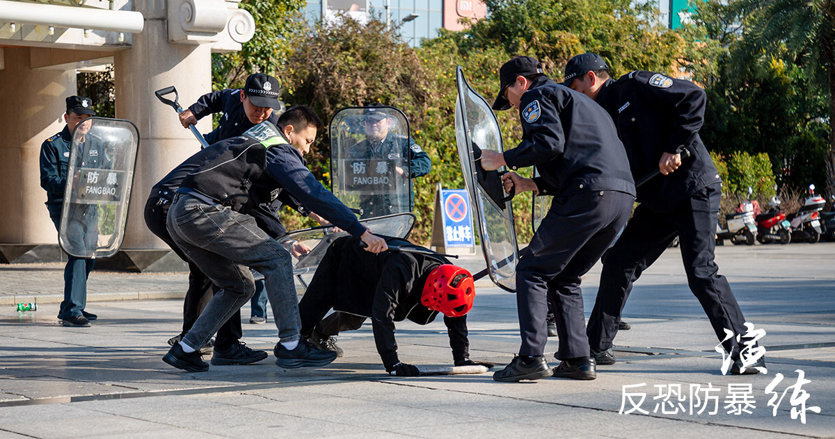 保卫部接到报告后,立即启动反暴恐事件应急处置预案,第一时间向公安机关报警,并派出由4名校卫队员组成的“盾棍叉”战斗队赶赴现场。处置小组迅速形成合围态势,并利用盾牌构建防御屏障,找准时机用脚叉锁住“暴徒A”脚部,并使用约束带将其控制。此时,公安机关第一出警组已抵达现场,第二出警组则由北门入校,快速向广场方向移动。