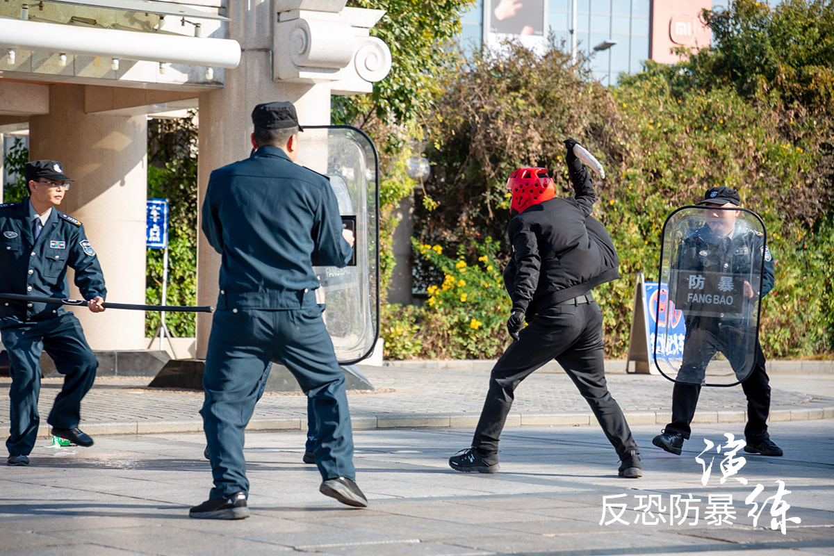 演练的情景设定为两名“醉酒暴徒”意图报复社会,携带凶器闯入校园对行人实施砍杀。现场,随着学校党委副书记杨云良宣布演练开始,只见一名身后藏刀的“暴徒”尾随师生试图通过行人通道,被校门当值保安发现并大声示警,同时向保卫部报告情况。