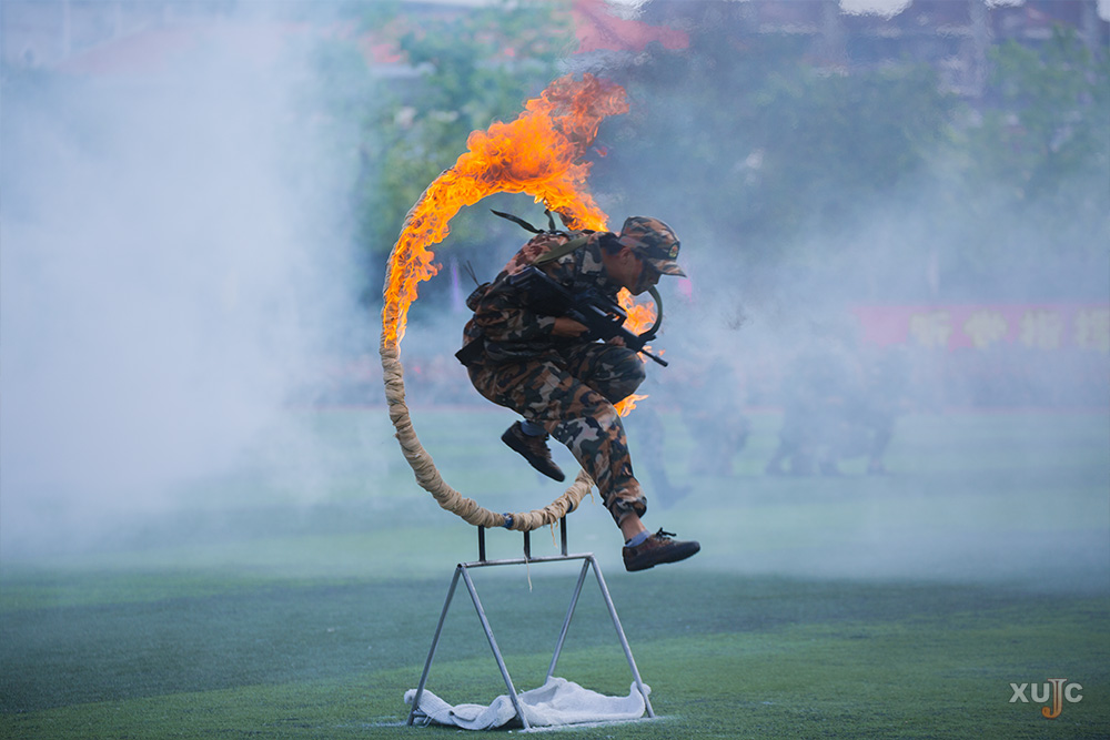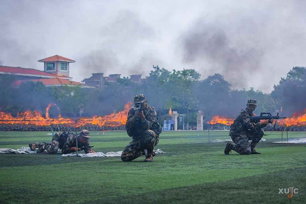 登陆集结、隐藏突进、要点夺控……三营学子带来了侦查步兵登陆作战行动的汇报演示。演示共分为3个战斗行动小组(军训男女学员各一组、教官一组),共设置9项障碍(三角锥、阻绝墙、轮胎、火圈、铁丝网、救治伤员、“染毒地带”、爆破碉堡)模拟登陆作战战场环境,呈现了一场精彩绝伦的视觉盛宴。