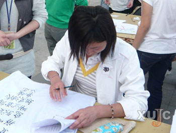 比赛现场,大部分同学都是进行“绘制”,而中文系的曹欣同学却是采用“书写”形式。她用毛笔在文化衫上写道:超拔处,卓影任修长。多少凌云鸿远志,虚心到老莫轻狂。贫瘠愈刚强。“这是一首颂竹诗,希望学长学姐在走出校门后,依然可以具有竹子的品格。”她略带腼腆地解释道。评委们也表示很欣赏这首诗,希望如竹子般遇风不折,笔直挺立。