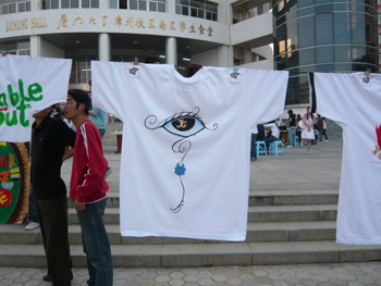 在这里,选手们找到了一片尽情展示创意,表达感情,挥洒青春的舞台。五花八门的作品更是让评委和观众连连称赞。“小猪,小猪,太可爱了”,“你快过来,这边有个肚兜”,“好喜欢这只眼睛啊”,“哈哈,这个彩虹太漂亮了”……现场观摩的观众看着一件件漂亮的文化衫都忍不住七嘴八舌地赞叹着。而评委们,来自04级的学长学姐也对这些出自学弟学妹之手的“礼物”喜欢不已。