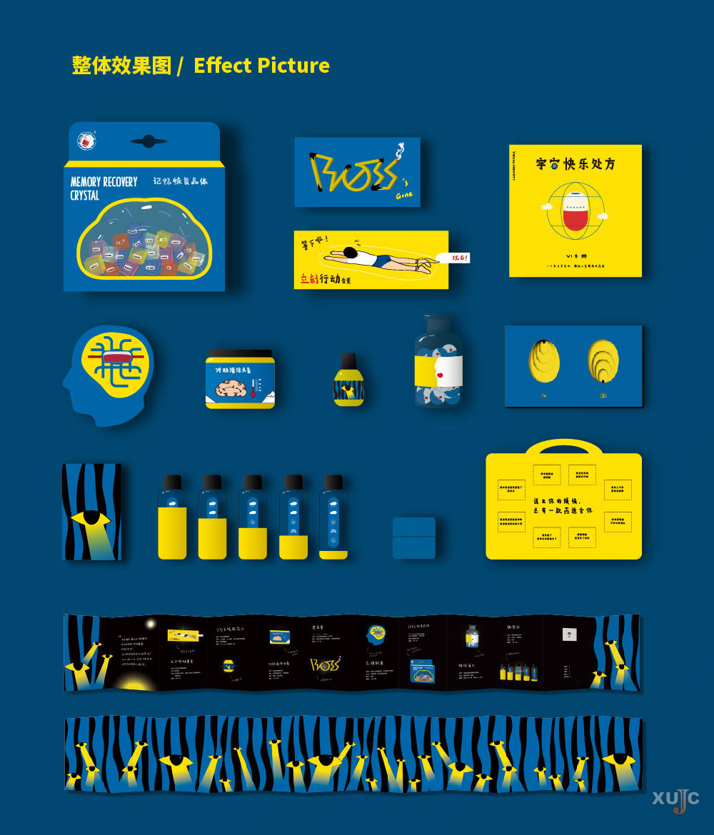 其中,“宇宙快乐处方”就属参展的14件品牌设计作品之一,出自黄雅琪同学之手。这组作品通过诙谐、创意的方式创造了一个可以解决人类烦恼的“药馆”。譬如快乐水,装水的瓶子利用天气元素作为水位线,随着喝水的进度,水位变化,瓶身上的标签就会由“乌云”转为“笑脸”,寓意心情从低落到快乐。
