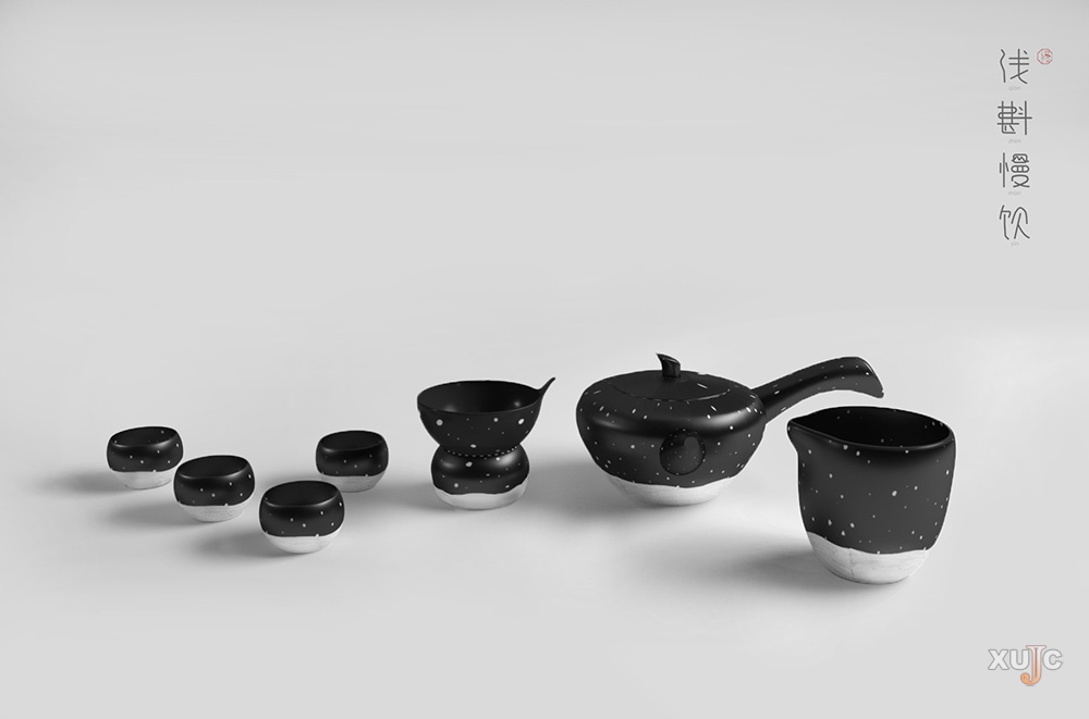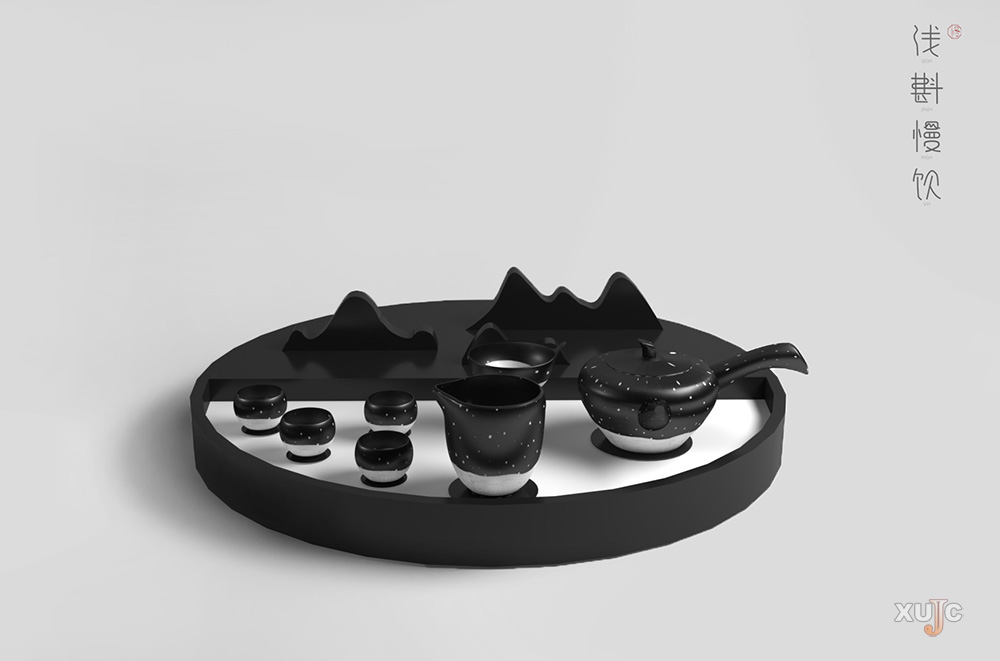 从“心”出发的作品还有廖晨夙同学的“浅斟慢饮”。她关注“慢”,以“雪”为主题,对茶具及其茶具包装进行创作设计。这组设计在不改变传统茶具的形态下融入“雪”元素,茶具底色为黑色,底部白色部分为“积雪”,白色小点象征飘落的“雪花”,就连整体的外包装都极尽“雪”意境的体现——用棉花包裹周围,棉花柔软,既可防止茶具摇晃,又有“雪”意。