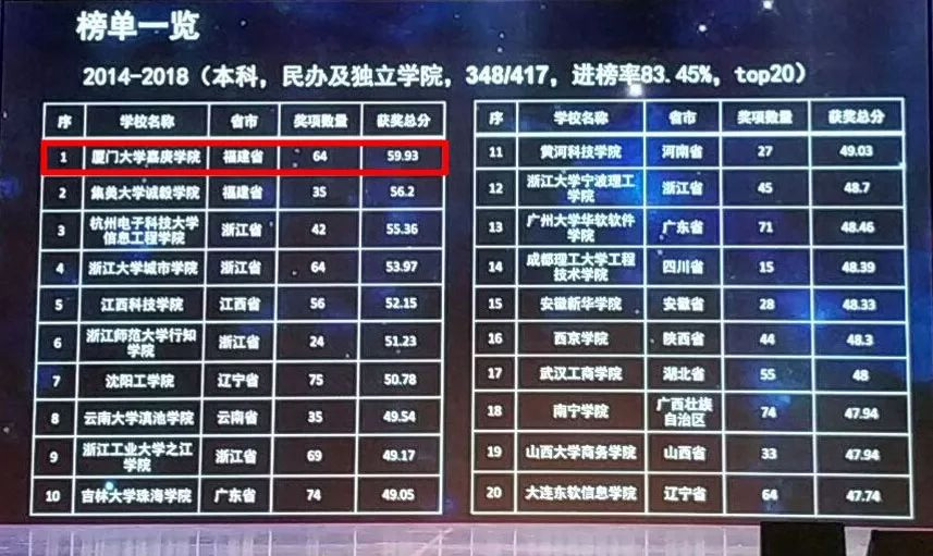 在《2014-2018年全国普通高校学科竞赛评估结果(本科)TOP300》中,我校在全国近3000所高校中位居第179位,在全国民办高校、独立学院中位居第一!我校也是全国730多所民办高校、260多所独立学院中唯一进入200强的。