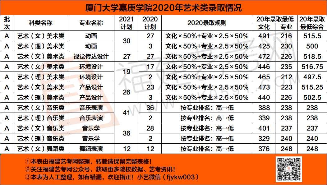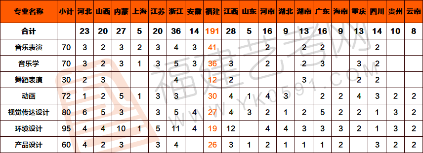 3.福建省艺术类实行“一档多投”方式,美术类投档后按综合分排序择优录取, 其他艺术类别投档后按专业成绩排序择优录取。