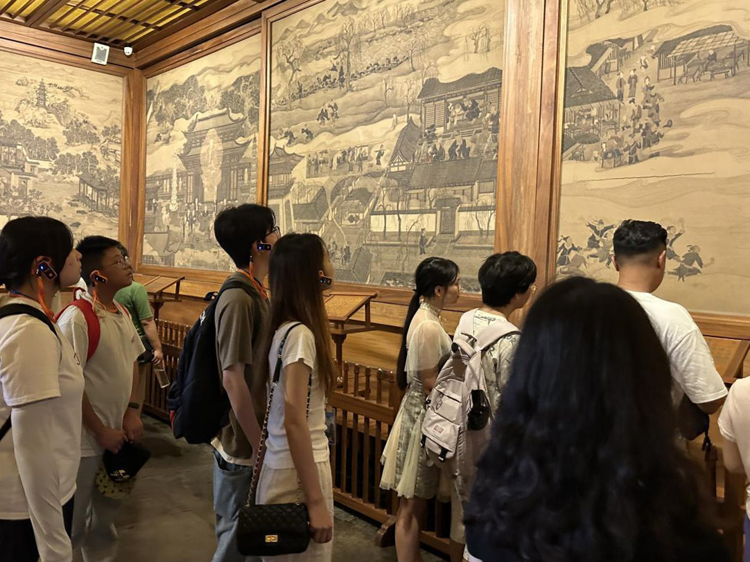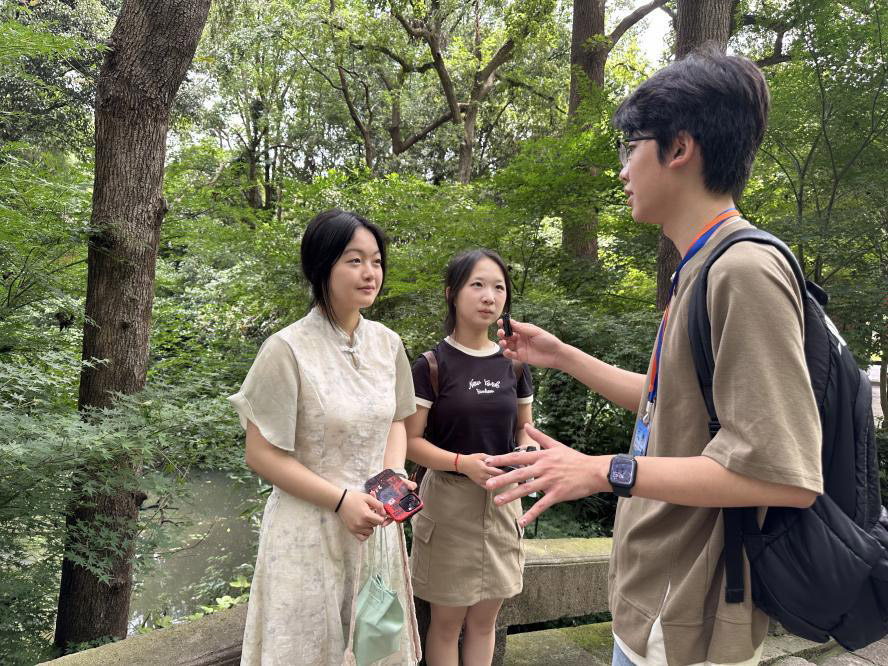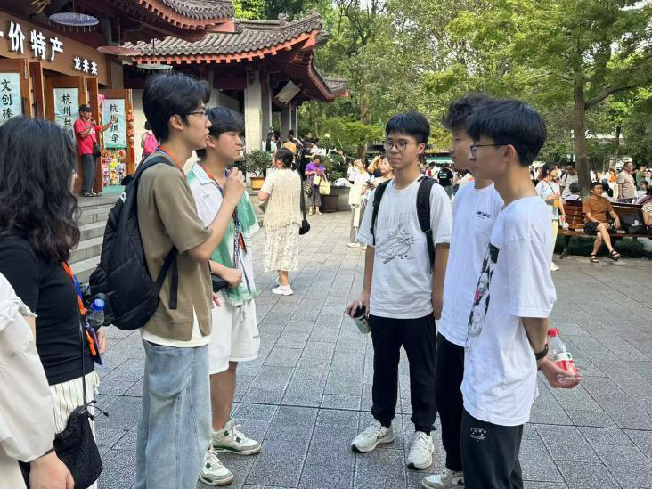 在与杭州民众的聊天中,实践队队员们调研了大家对文化传承的期待。其中,面对来杭州研学的中学生,队员们以“黄檗东传”“禅茶传日”等故事为切入点,生动解读杭州作为“活态文化交流样本”的价值。“原来西湖的桥影响过日本建桥”“抹茶竟然和我们的径山茶宴有关”……中学生们的惊叹让队员们明白:文化传播不必高深,用青春语言讲好故事,就能让年轻一代触摸到文明互鉴的温度。