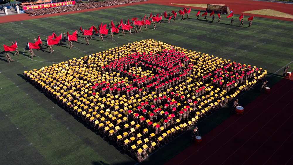 分列式之后,由1300名新生组成的旗语活字表演方阵或持彩板或擎红旗,像翻滚的麦浪一般,以激动人心的倒数计时拉开变换序幕,继而,红船、党徽等图案次第呈现,深情告白伟大祖国,致敬中国共产党百年光辉历程。