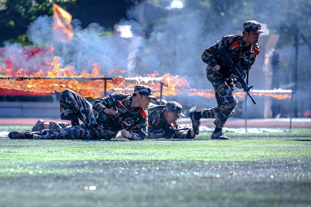 高墙、沙坑、火圈、铁丝网、“侦察机”;行进间卧倒、低姿匍匐前进、步兵抢滩登陆、炮兵火力支援……压轴科目战术综合演练在“狼烟四起”时上演。登陆集结、隐蔽突进、要点夺控……教官和大学新生以“红蓝对抗”的方式展开“战斗”,全要素、超逼真的演练引爆全场。