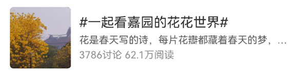 年度阅读冠军,当属#一起看嘉园的花花世界#。一花一叶,一图一景,阅读量突破62万,这是春光在“嘉园”的盛大展演,也是我们集体按下快门的诗意共鸣。