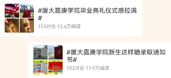重要的时刻需要郑重的标注。#厦大嘉庚学院毕业典礼仪式感拉满#(阅读量13.4万)为求学时光画上庄重句点,#厦大嘉庚学院新生这样晒录取通知书#(11.9万)则为全新的旅程写下闪亮开篇。仪式感,是“嘉”给予“嘉”人独有的浪漫。