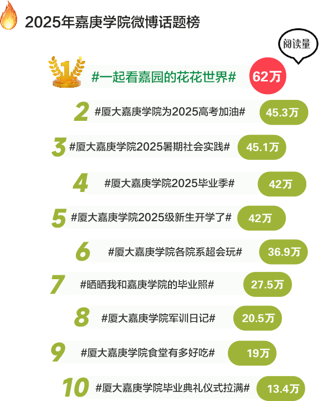 如果说记忆是散落的拼图,那话题就是我们共同拾起的碎片。在2025年的时间轴上, @厦门大学嘉庚学院 用17个专属话题,创造了394.7万次的阅读,拼出了“嘉”的万千种模样。