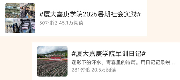 迷彩是成长的底色,实践是青春的诗行。#厦大嘉庚学院2025暑期社会实践#(阅读量45.1万)记录着行走的课堂,#厦大嘉庚学院军训日记#(20.5万)铭刻下汗水浇灌的蜕变。这两个话题见证着“嘉”人的成长,记录了他们走向广阔天地的脚印。
