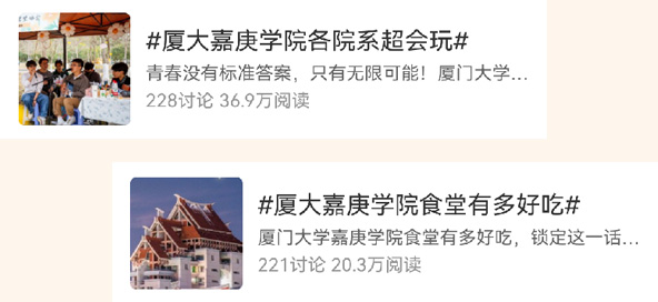 青春的活力在课堂内外肆意绽放。#厦大嘉庚学院各院系超会玩#(阅读量36.9万)展现了各院系教学、社团活动的多姿,#厦大嘉庚学院食堂有多好吃#(19万)则飘出最抚慰人心的烟火气。“嘉园”,每个角落都上演着生动。