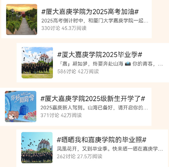 从高考前的呐喊到毕业时的回眸,@厦门大学嘉庚学院 以话题为信,完成一场青春的接力。#厦大嘉庚学院为2025高考加油#(阅读量45.3万)送上诚挚祝福,#厦大嘉庚学院2025毕业季#(42万)与#厦大嘉庚学院2025级新生开学了#(42万),则见证了一程的终点与另一程的起点。#晒晒我和嘉庚学院的毕业照#(27.5万)则定格了青春最灿烂的笑脸。