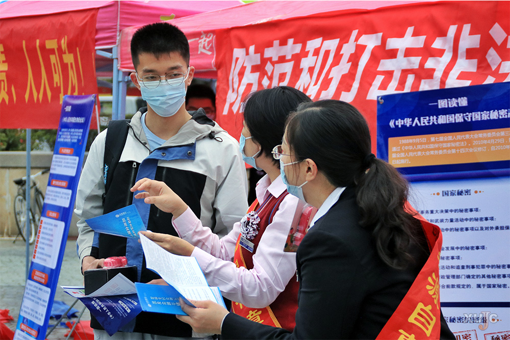 现场设有多个宣传摊位,拉起“国家安全,人人有责,人人可为”的横幅。工作人员为学生精心准备了大量有关反邪教、防范电信网络诈骗、反假货币、识别非法金融活动、远离校园贷款等主题的知识宣传手册。当学子们阅读宣传手册时,工作人员在旁认真为学生们讲解国家安全知识、分析当下金融环境。现场还有一图读懂《中华人民共和国生物安全法》、《反恐怖主义法》,个人金融信息风险防范要点等制作精良的宣传立板,旨在让同学们更加细致地了解国家安全相关法律,也引导学生积极维护自身金融消费者权益。