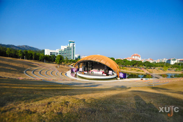这里绿草成茵,满树柔光飘洒,偶有隐藏在树旁的小野花随着日暮黄昏被镀上了一层金色的光。顺着阶梯一层层往上走,体验到的是与平地上不一样的景致。往远处眺望,云遮雾绕,隐约可见的山,具有嘉庚特色的主楼群和“小巨蛋”尽收眼底。