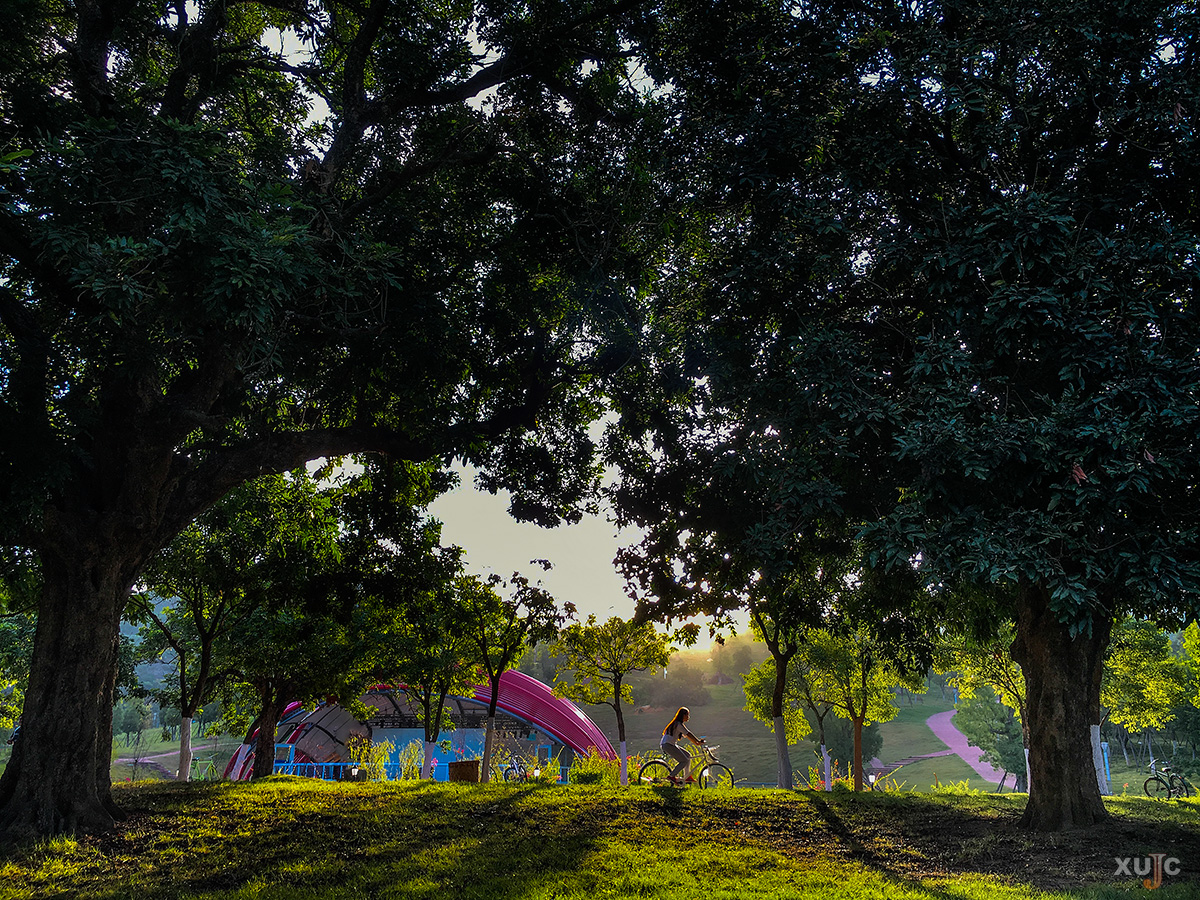 我见过它清晨被阳光照耀的时刻,有穿透力的光线击破它一夜的沉静,向世界宣告新的一天又开始了。路上,有避开高峰期工作的“校园环卫者”,也有与我志同道合的晨读“嘉”人。这时,我总会扬起脸,呼吸着初晨最新鲜的空气。