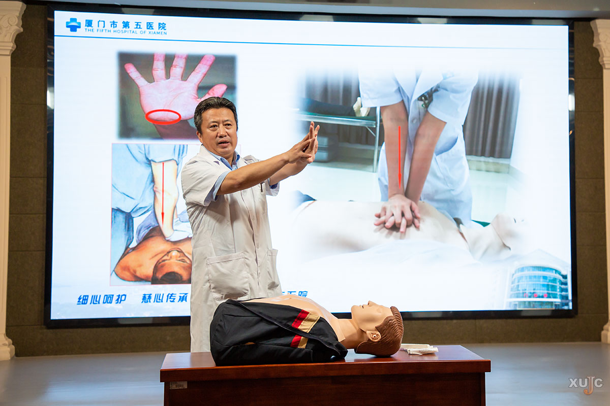 捐赠仪式结束后,厦门市第五医院急诊科副主任杨凯春、医生张金延,携手我校医务室医生林达峰,为在场师生带来了一场生动实用的AED使用与徒手心肺复苏(CPR)技能培训。