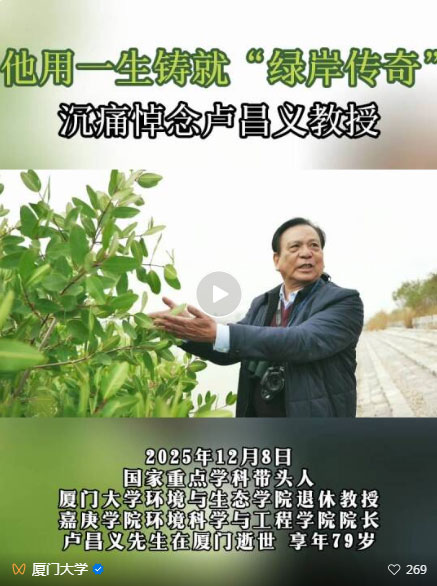 中国共产党党员,国务院政府特殊津贴专家,厦门大学环境与生态学院教授、博士生导师,厦门大学嘉庚学院环境科学与工程学院院长卢昌义同志,因突发疾病经抢救无效,于2025年12月8日19时10分在厦门逝世,享年79岁。
