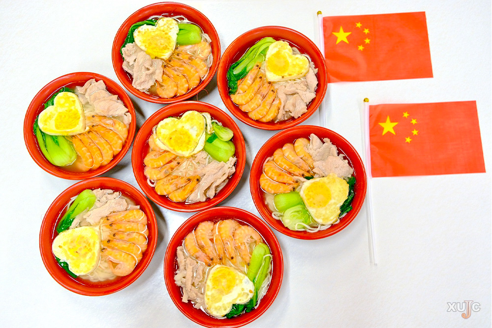 国庆逢中秋,家国共团圆。明天将迎美好的双节假期,您打算怎么过?今天,我校食堂同步推出“一碗国庆面 无限爱国情”活动,热乎乎的现煮汤面,压上5条红红火火的鲜虾、3片厚实嫩滑的瘦肉、2根翠绿青菜,最后,一颗爱心煎蛋燃情加入,您的“国庆面”,好了,请君慢用!