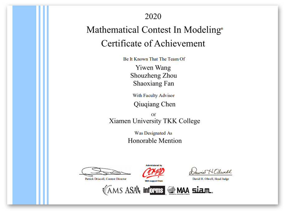 近日,2020美国国际大学生数学建模竞赛(MCM/ICM)(以下简称“美赛”)获奖名单揭晓,我校参赛队伍获得了H奖(Honorable Mention)1项、S奖(Successful Participant)3项的佳绩。