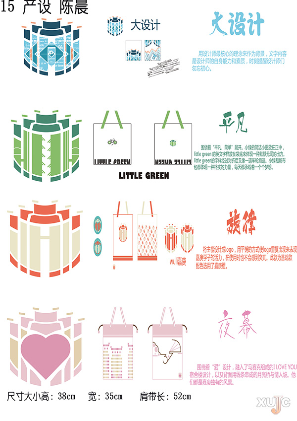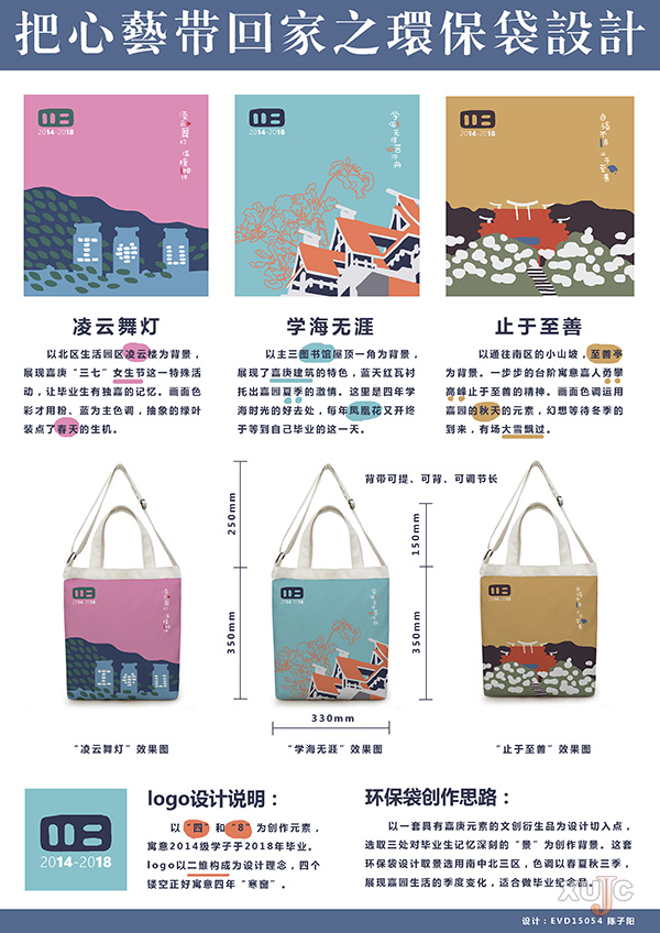 本次纪念品设计大赛以“环保袋”作为创作载体。从“小绿”、月亮桥、到凌云楼“三七”女生节亮灯仪式、别具特色的主楼群,参赛学子发挥自身专业优势和创意,巧妙地把“嘉”的元素和“环保”理念融合在一起。据悉,艺术设计系会选择两至三款获奖作品进行量产,作为2018届艺术设计系毕业生的毕业礼物。