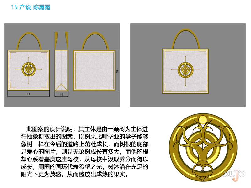三等奖获得者、2015级产品设计专业学子陈露露,以树来比喻毕业的学子,希望他们在今后的道路上能像树一样茁壮成长;树根的底部是爱心的图片,寓意无论树如何成长,它的根永远心系着嘉庚学院这所母校;图案中的光圈代表希望之光,指树在充足的阳光下更为茂盛,从而结出成熟的果实,寓意学子从母校汲取养分获得成长。
