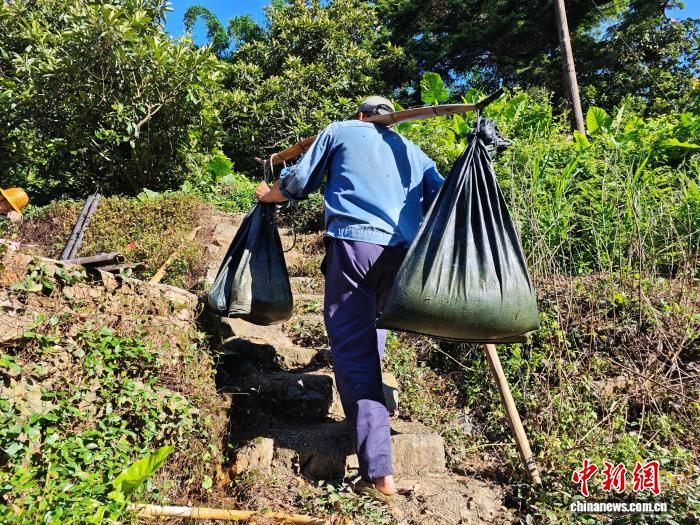 图为在福建省莆田市仙游县书峰乡上楼村,村民挑着制作好的靛泥走在田间。唐刚 摄